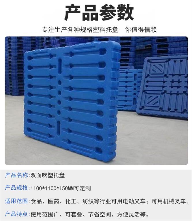 3.雙面吹塑塑料托盤(pán)產(chǎn)品選用高分子量高密度聚乙烯樹(shù)脂,經(jīng)擠出一次吹塑成型。成型過(guò)程快速、充分;產(chǎn)品成型飽滿,內(nèi)在質(zhì)量和性能穩(wěn)定。