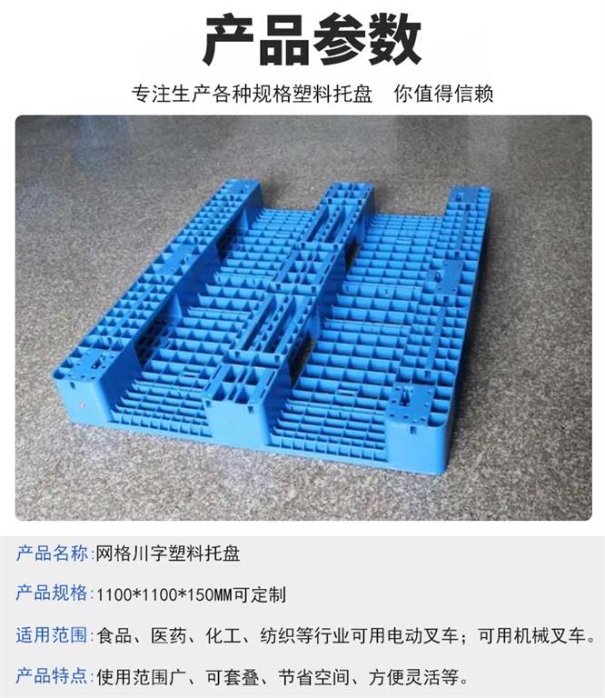 網(wǎng)格川字塑料托盤分類:1、單面塑料托盤只能一面使用,表面有網(wǎng)格狀和平板狀兩種,底部有川字型、田字型或九只方墊腳型、根據(jù)承載量和使用場合的不同分為貨架系列、標(biāo)準(zhǔn)系列和較輕系列三種標(biāo)準(zhǔn)。